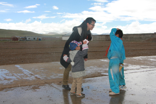 2007年8月援教期滿后,白覺措回到拉薩,在當雄縣納木湖鄉(xiāng)中心小學任教。四千八百米的納木湖鄉(xiāng)中心小學是拉薩市海拔最高的學校。每到冬天,這里都會迎來大風雪。而在大雪封山時,蔬菜是運不進來的。所以,白覺措和其他老師還要利用休息的時間帶領(lǐng)學生們在學校的高寒溫棚內(nèi)自己種菜,以備不時之需。白覺措淡淡得說道:“這里的夏天是很美,冬天卻讓人受不了。而且夏天并不是天天都是風和日麗,時不時還會來場冰暴。”正說話間,豆大的冰雹就下起來,“噼哩叭啦”打在窗戶上。白覺措急忙起身向外走去,因為正值午飯時間,學生們正朝食堂走向。天冷地滑,怕學生摔倒白覺措拉著自己兩歲半的兒子,站在空地上,對著遠處跑來的學生不停地喊道:“慢點,慢點,小心摔倒!……”。