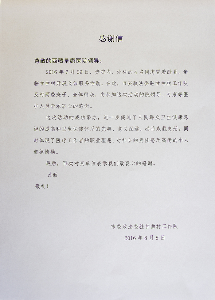 ▲市委政法委駐朱加村、甘曲村工作隊(duì)特意為阜康醫(yī)院送來(lái)感謝信