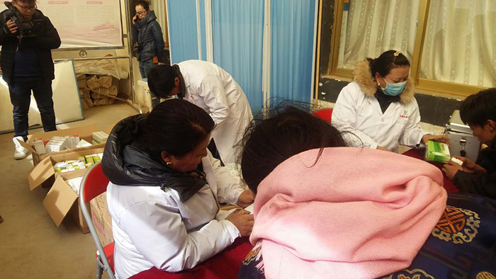 義診活動在下午三點半開始,前來就診咨詢的群眾絡(luò)繹不絕。醫(yī)務(wù)人員在為患病群眾把脈號診、開處方的同時,結(jié)合那曲縣羅瑪鎮(zhèn)群眾常見病、多發(fā)病及高海拔地區(qū)的氣候特點,給當(dāng)?shù)厝罕娞岢隽巳粘I铒嬍辰ㄗh,在疾病預(yù)防、降低常見病發(fā)病率方面提供生活指南。義診期間,醫(yī)療服務(wù)小分隊醫(yī)務(wù)人員加班加點,共為羅瑪鎮(zhèn)的400余名群眾進(jìn)行了義診檢查,發(fā)放藥品價值2萬余元,在為患病群眾解除病癥、減輕病痛的同時,切實溫暖了廣大群眾的心。