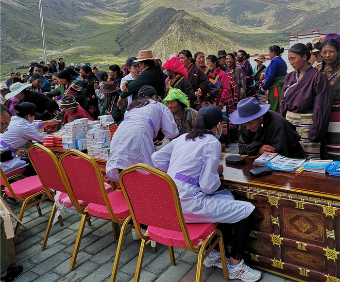 當(dāng)天上午,全國婦聯(lián)宣傳部、自治區(qū)婦聯(lián)、拉薩市婦聯(lián)、那曲市婦聯(lián)一行來到安置點為群眾贈送了藏漢雙語書籍。阜康義診工作隊也來到現(xiàn)場為安置點居民量血壓、檢查病情并詢問身體情況,耐心細致地為群眾分析病情、講解日常衛(wèi)生保健、合理用藥等衛(wèi)生常識,認真解答關(guān)于常見病、多發(fā)病的預(yù)防診治及愈后注意事項。僅一個上午時間就為100余名安置點群眾開展了問診、聽診、答疑、測血壓和健康知識宣傳,免費發(fā)放各類藥品價值4萬余元 。