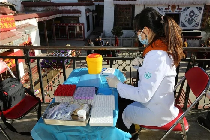 上午8點,朱主任一行人分別從阜康婦產(chǎn)兒童分院和阜康健康體檢中心兩路出發(fā),經(jīng)過一個多小時的路途顛簸,于9點15分到達雄色寺,尼眾和駐寺干部們早已等候在寺廟庭院內(nèi)。由于體檢項目中有血液檢查,不能進食,為了不讓尼眾和干部們?nèi)甜囂?,朱主任一行人到達雄色寺以后,快速整理現(xiàn)場,將所用儀器與藥品一一擺放整齊,在區(qū)婦聯(lián)領導講話以及受邀律師宣講完畢以后,立刻投入為各位尼眾與干部體檢的工作當中。