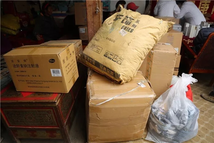 西藏阜康天使基金會副秘書長吉拉女士向村民贈送生活用品