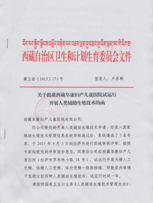 關于批準西藏阜康婦產(chǎn)兒童醫(yī)院試運營開展人類輔助生殖技術的函
