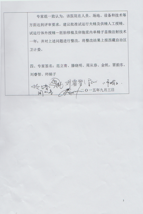 你公司提交的開展人類輔助生殖技術申請,經(jīng)錄入國家輔助生殖技術管理信息審核通過后,系統(tǒng)遴選了7名專家,于2015年9月3日到拉薩市進行實地審核評審。按照專家組提交的評審報告意見,同意你公司在西藏阜康婦產(chǎn)兒童醫(yī)院(拉薩市羅布林卡路18號),試運行開展精子人工受精、供精人工受精、體外受精-胚胎移植、卵胞漿內單精子顯微注射四種人類輔助生殖技術,試運行時間一年。