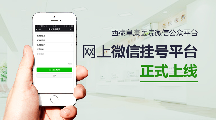 昨日,記者從西藏阜康醫(yī)院獲得好消息:5月24日,西藏阜康醫(yī)院微信公眾平臺(tái)網(wǎng)上預(yù)約掛號(hào)系統(tǒng)正式上線(xiàn),可提供微信掛號(hào)、在線(xiàn)問(wèn)診、健康咨詢(xún)、新聞動(dòng)態(tài)等服務(wù)。