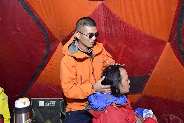 在海拔5500米處的雪線位置,教練們,選擇了一處較為平緩的雪坡,作為大本營,在這里對隊員們進(jìn)行登頂前的指導(dǎo)訓(xùn)練。指導(dǎo)隊員們使用上升器與下降器,體驗穿著高山靴帶著冰爪走路的感覺,教練們在這里認(rèn)真介紹技術(shù)要領(lǐng),并耐心解答隊員們提出的各種問題。休息之余大家都躲在帳篷里,有說有笑,完全消除了屋外雪山的寒冷。有從內(nèi)地來的隊友,因高原反應(yīng),頭疼難忍,張洪就幫他們一一按摩推拿,緩解疼痛,大家就像一家人,其樂融融。